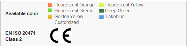 100% polyester fluorescent fabric,120g/m2, 5CM silver reflective tape detail, With PVC transparent ID badge pocket, Zipper front closure to secure.